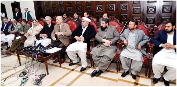 Parliamentary leaders of Jamiat Ulema-i-Islam-Fazl, Jamaat-i-Islami, Awami National Party, Qaumi Watan Party and Pakistan People’s Party, Speaker of the provincial assembly Asad Qaisar and ministers attended the briefing.