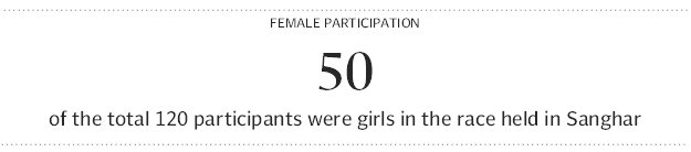 The race in Sanghar started at 10am with two teams: blue and green. Each team comprised 60 students. Out of the total 120 children, 50 were females. The participating children were given shoes, socks, T-shirts and caps free-of-charge while their families saw them sprint towards the finish line. The blue team crossed the line first to grab the winner’s trophy.
